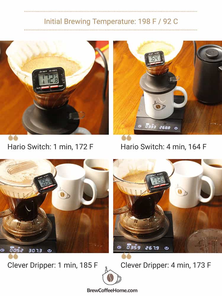 The Hario Switch doesn’t have a lid, so after four minutes of steeping, the temperature drops from 194F (90C) to 164F (73C). Not surprisingly, thanks to its lid, the Clever Dripper keeps the liquid hotter for longer, with the temperature remaining above 173 F (78C) after brewing.